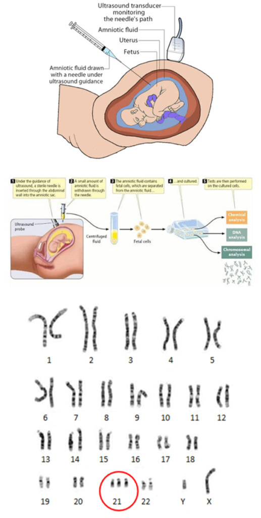 அம்னோசென்டெசிஸ் (Amniocentesis) ஒருகாரியோடைப்பை உருவாக்குகிறது–குழந்தையின் குரோமோசோம்களின் படம்–ஏதேனும் அசாதாரணங்களைக்கண்டறிய. (சுமார் 1 சதவீதமாதிரியில்சிக்கல் உள்ளது, மேலும்சோதனைபலனைத்தரவில்லை.)